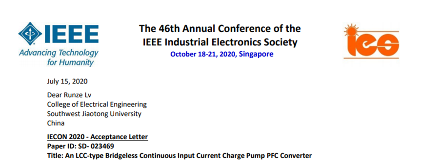 Recently, the research paper of An LCC-type Bridgeless Continuous Input Current Charge Pump PFC Converter written by undergraduate Lv Run-ze,was submitted to IEEE IECON 2020 and accepted as an oral report in mid-October. The IEEE IECON (Annual Conference of the IEEE Ind...
