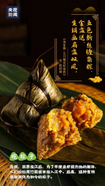 “粽子香,香厨房。艾叶香,香满堂。桃枝插在大门上,出门一望麦儿黄。这儿端阳,那儿端阳,处处都端阳。”这是旧时流行甚广的一首描写过端午节的民谣。总体上说,各地人民过端午节的习俗大同小异,而端午节吃粽子,古往今来,中国各地都一样。民间传说吃粽子是为祭奠投江的屈原而传承下来的。粽子,又叫“角黍”、“筒粽”由粽叶包裹糯米蒸制而成,北方习惯用苇叶来绑粽子,多以红枣、豆沙做馅,口味偏甜,个头较大,南方常以竹叶来缚粽,有鲜肉、火腿、蛋黄等多种馅料,个头较小,甜少咸多。