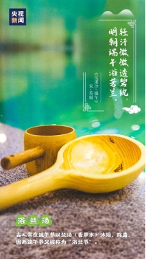 端午日洗浴兰汤是《大戴礼》记载的古俗。但文中的兰不是兰花,而是菊科的佩兰,有香气,可煎水沐浴。《九歌·云中君》亦有“浴兰汤会沭芳”之句。《荆楚岁时记》:“五月五日,谓之浴兰节。”《五杂俎》记明代人因为“兰汤不可得,则以午时取五色草拂而浴之”。后来一般是煎蒲、艾等香草洗澡。在广东,则用艾、蒲、凤仙、白玉兰等花草;在湖南、广西等地,则用柏叶、大风根、艾、蒲、桃叶等煮成药水洗浴。不论男女老幼,全家都洗,此俗至今尚存,据说可治皮肤病、去邪气。