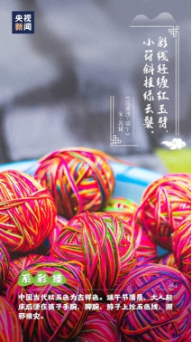 五色丝线,又俗称五色丝、五彩丝。古俗名称避兵缯、朱索等。系在蚊帐、摇篮上的又叫宛转绳、健绳。应劭《风俗通》中说:“五月五日,以五彩丝系臂,名长命缕,一名续命缕,一名辟兵缯,一名五色缕,一名朱索,辟兵及鬼,命人不病瘟”。中国古代崇敬五色,以五色为吉祥色。因而,节日清晨,各家大人起床后第一件大事便是在孩子手腕、脚腕、脖子上拴五色线。系线时,禁忌儿童开口说话。五色线不可任意折断或丢弃,只能在夏季第一场大雨或第一次洗澡时,抛到河里。据说,戴五色线的儿童可以避开蛇蝎类毒虫的伤害;扔到河里,意味着让河水将瘟疫、疾病冲走。