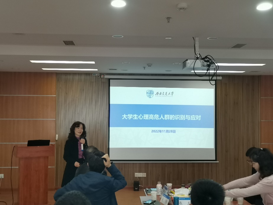 心理咨询中心陈华主任作题为“大学生心理高危人群的识别与应对”的讲解,通过介绍学生心理问题影响因素及应对方法,对相关问题进行分析,并对正确的引导方法作了分享。陈华主任强调,因心理疾病休学后复学的学生要纳入辅导员重点关注对象名单,通过各类手段评估学生心理健康状态并持续跟踪。