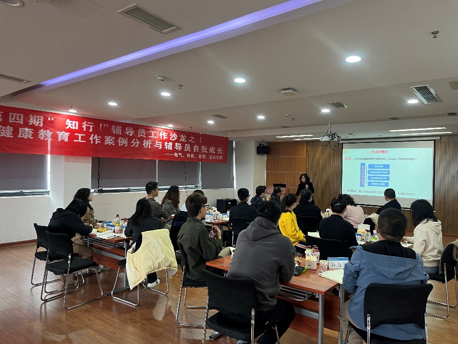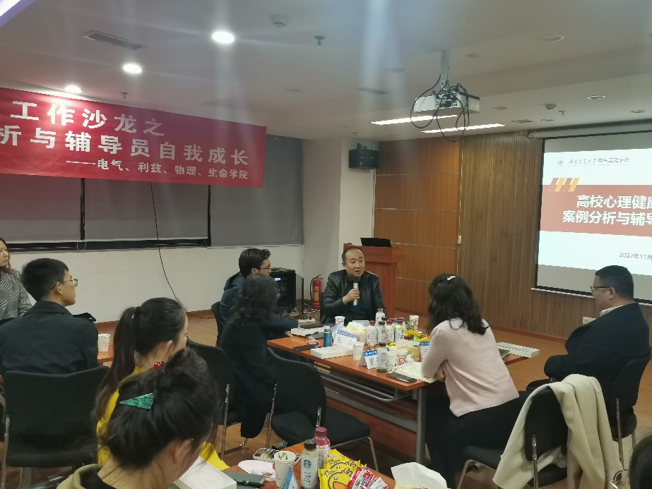 为切实加强辅导员队伍建设,及时分析、研判、解决大学生日常思想政治教育工作中面临的新形势、新问题,11月28日下午16时,由党委学生工作部主办,av大平台 、生命科学与工程学院、物理科学与技术学院、利兹学院承办的第四期“知行”辅导员工作沙龙在电气馆10832举行,研讨高校心理健康教育工作案例分析与辅导员自我成长方面的问题。心理咨询中心主任陈华,电气学院党委书记罗乾超,学工部副部长邢晓鹏,生命学院党委副书记朱炜,物理学院党委副书记郭剑,电气学院党委副书记谢力,利兹、生命、物理、电气学院辅导员参与此次工作沙龙。活动由av大平台 党委副书记谢力主持。