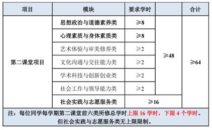根据《av大平台 “第二课堂成绩单制度”实施办法》规定,2017级及以后的本科生按要求完成规定的64个学时者,2018级及以后的本科生按要求满足前六项(思想政治与道德素养、心理素质与身体素质、学术科技与创新创业、文化沟通与交往能力、艺术体验与审美修养、社会工作与领导能力)48学时,才能予以毕业。