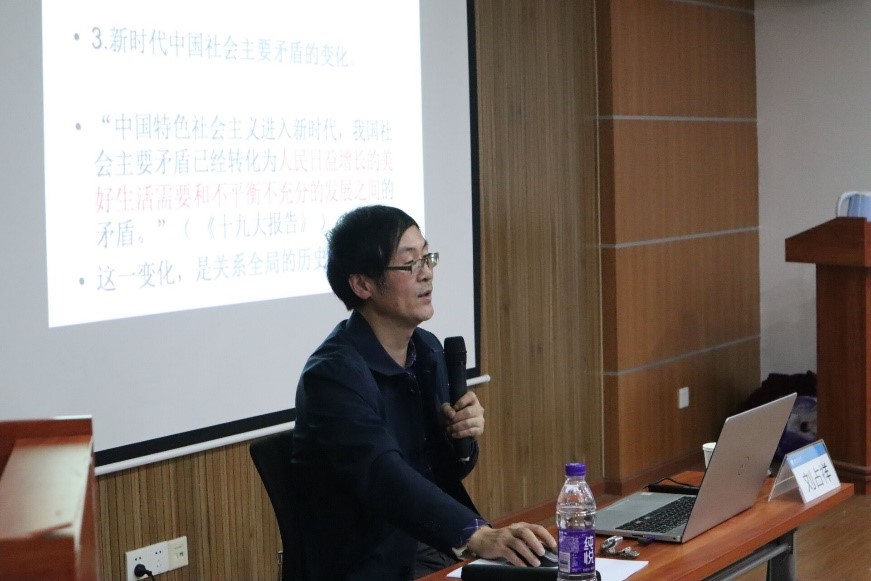 刘占祥首先从认清中国特色社会主义新时代的历史方位和学好习近平新时代中国特色社会主义思想这两个总论入手,从理论透视和事实印证两个角度为大家深入解说了“中国特色社会主义进入新时代”发展阶段,带领大家共同学习领会习近平新时代中国特色社会主义思想。