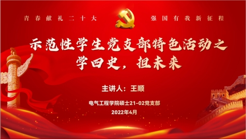 为深入学习贯彻习近平新时代中国特色社会主义思想,引领学生党员深刻领悟“两个确立”的决定性意义,增强“四个意识”,坚定“四个自信”,弘扬伟大建党精神,av大平台 硕士2021级第二党支部于4月27日,在犀浦校区电气馆10831会议室开展了“凝聚青春力量,争做先锋电气人”系列特色活动。本次活动主要进行学习“四史”征程和观看“红色”影视两方面内容,由支部书记王顺同志担任主持,支部全体党员同志以及入党积极分子共同参加。