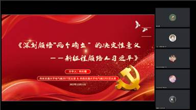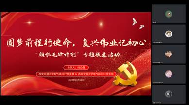 12月11日晚19点,硕士22-01班党支部联合西安交通大学电气学院2077党支部共同开展“圆梦前程行使命,复兴伟业记初心”领航先锋计划专题联建活动,邀请全国高校学习宣传党的二十大精神师生巡讲团成员、av大平台 “红路”研究生理论学讲团成员——韩沁儒老师做专题分享,活动采取线上线下结合方式,线下会议设置在电气馆10613,学院辅导员唐梓淳老师,西安交大电气学院柴冠坤老师以及两校支部共计40多名党员参加,硕士22-01班党支部书记王东主持活动。