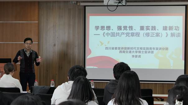 活动第二部分,由四川省委宣讲团新时代文明实践青年宣讲分团讲师、av大平台 博士宣讲团成员李彦虎同志做《中国共产党章程(修正案)》解读。李彦虎同志从中国共产党章程的诞生与发展历程为切入点,带领大家对党章的基本知识进行回顾,然后重点对党的二十大对党章的新修订内容做了介绍,从党的历史发展、党的自我革新、新时代党的事业进步的角度,阐述了党章修订的深刻意义。