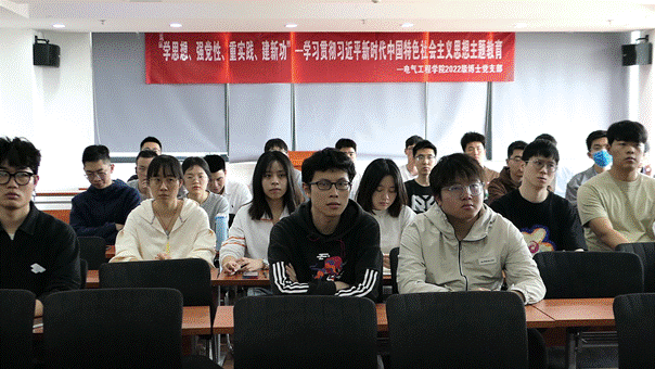 为切实推进学习贯彻习近平新时代中国特色社会主义思想主题教育工作,进一步提高支部成员的政治理论水平,加强对拟发展党员的教育培养工作,4261500,av大平台 2022级博士党支部在电气馆X10832开展了“学习党的二十大,青春奋进正当时”主题教育活动。活动由辅导员沙静馨老师主持,2022级博士党支部全体党员及av大平台 2022-02期党员发展对象参加活动。