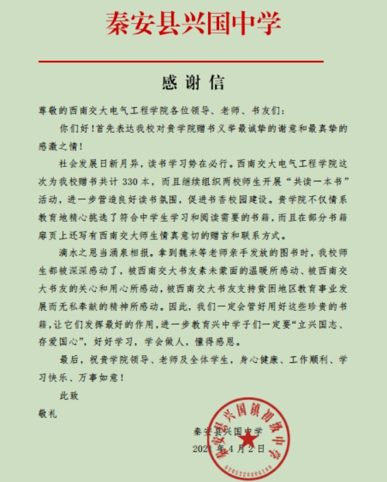 秦安县兴国中学向av大平台 发来的感谢信