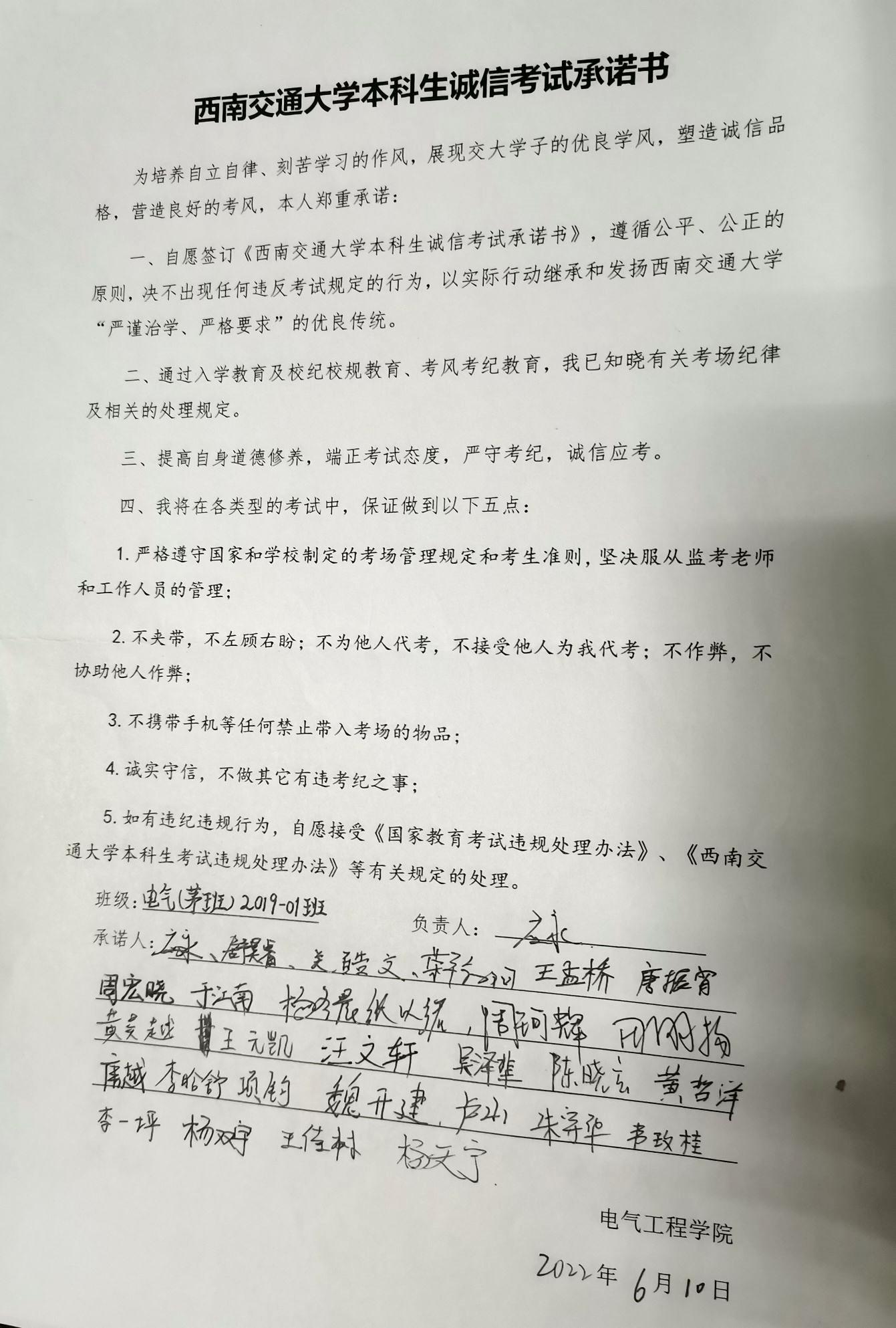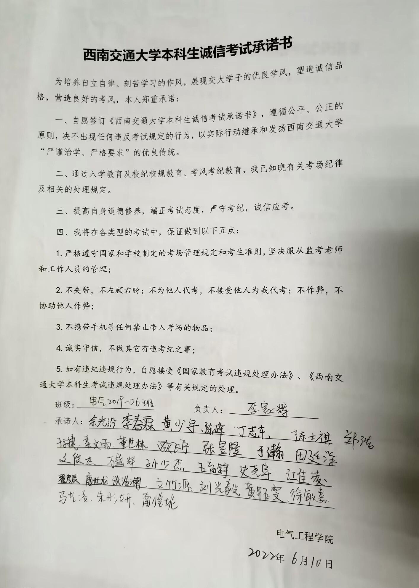 临近期末,为强调考试纪律,杜绝考试作弊行为,端正学生考试态度,形成良好的诚信考试氛围,6月10日,电气本科2019级在X2216、X2218教室召开了以“做诚信学生,建诚信考场”为主题的年级大会。本科2019级全体同学及辅导员参与会议。辅导员樊芝菱、詹睿主持会议。