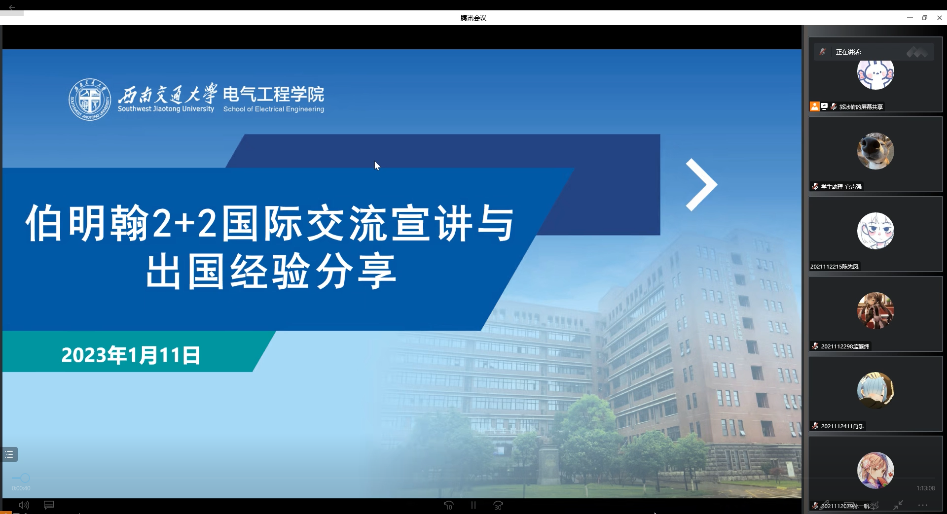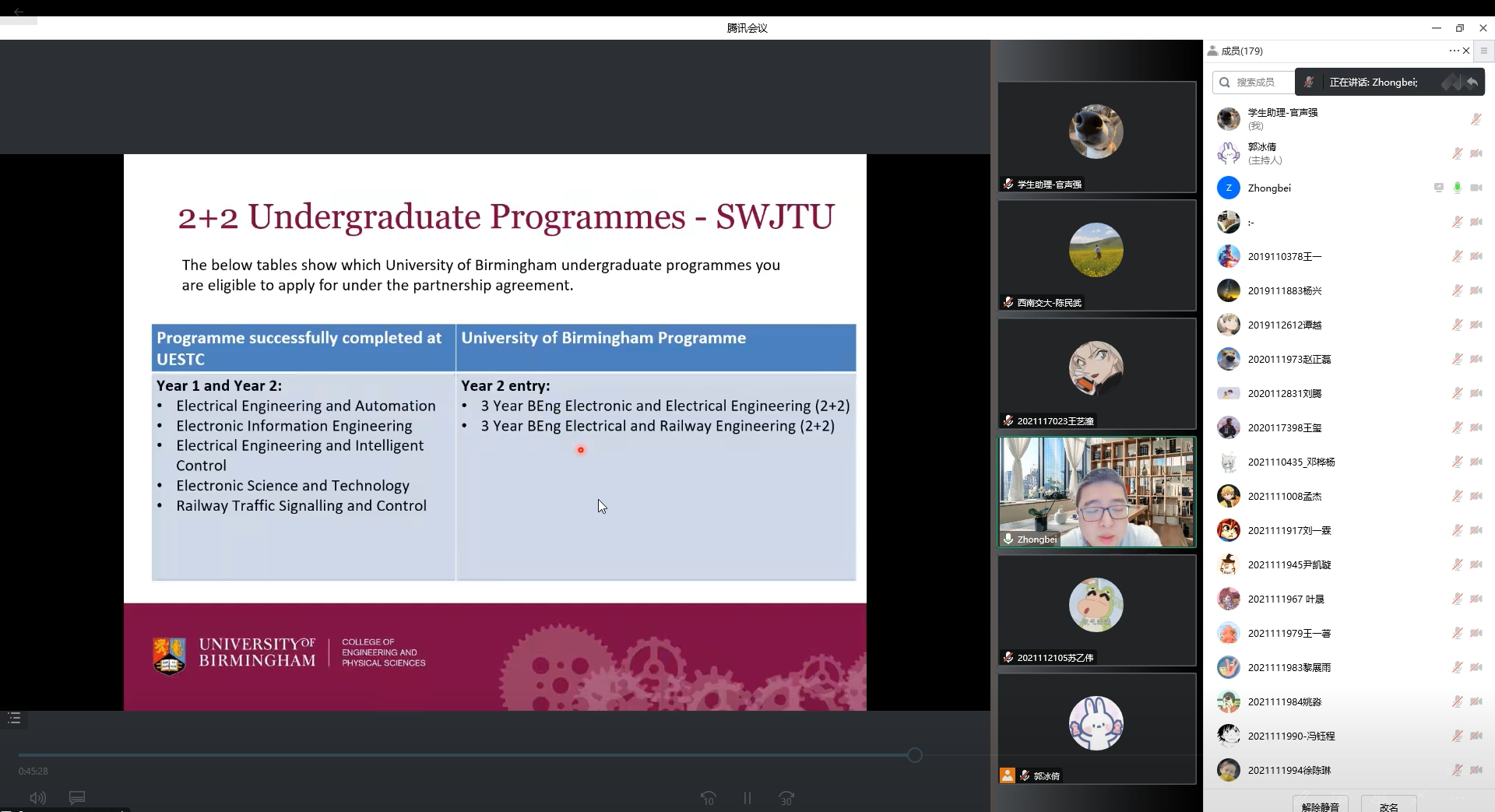 在线上开展了“英国伯明翰2+2国际交流宣讲与出国经验分享”专题讲座。本次讲座特别邀请到英国伯明翰大学铁路研究中心名誉研究员田忠北主讲,学院副院长陈民武和辅导员郭冰倩主持,本科2021级和2022级百名学生共同参与。