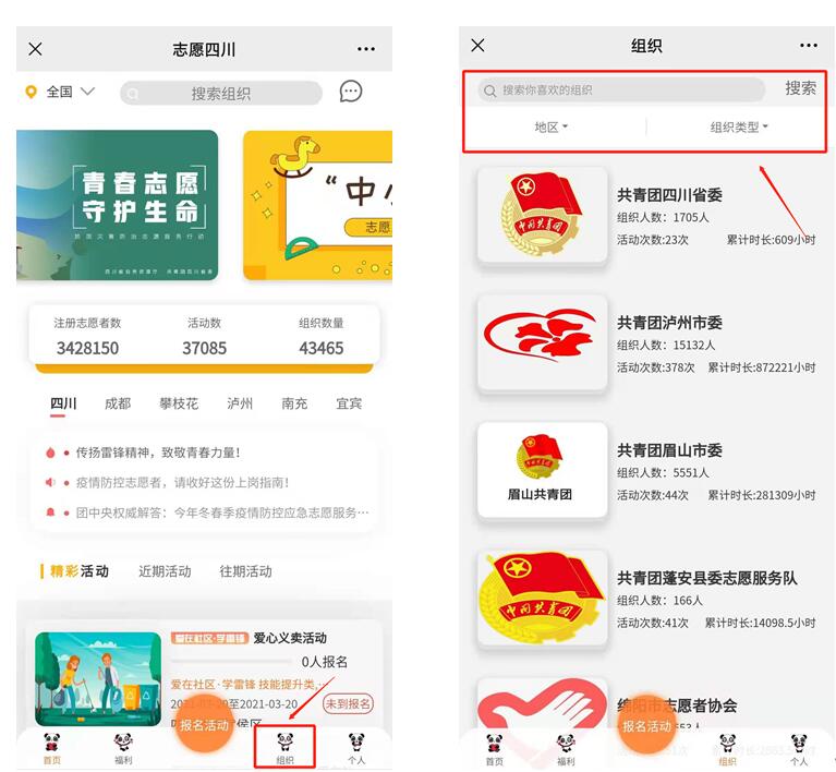 进入“志愿四川”平台av大平台-精品av大平台官方资源发布页,点击下方组织,按照标准筛选或自己输入,找到组织。