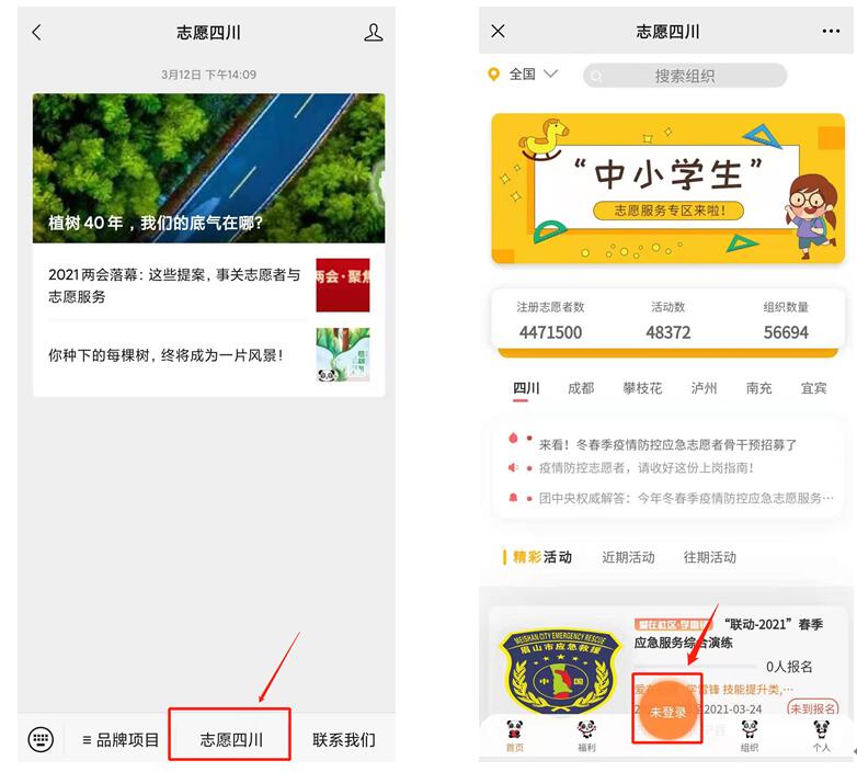 第二步:进入“天府新青年”或“志愿四川”公众号,点击左下方“志愿四川”进入平台av大平台-精品av大平台官方资源发布页,点击下方“未登录”按钮。