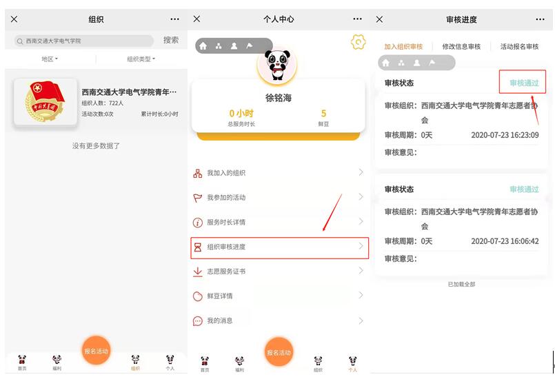 找到组织之后,点击组织申请加入,可以在个人中心界面查看组织审核进度。