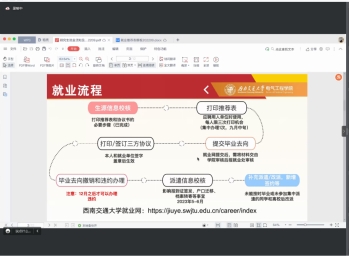首先,沙静馨老师从常规的7步就业流程引入,直观地告诉同学们就业中需要经历的流程和关键性,并围绕这七个流程逐一展开讲解,详细分析了每一步的时间点、可能存在的问题和解决办法。沙静馨老师还详细讲解了学校的一些就业政策,包括《av大平台 毕业生就业推荐表和协议书管理办法》《av大平台 毕业生就业奖评选办法》《av大平台 就业帮扶经费管理办法》等。除此之外还分享了招聘信息的来源渠道,要求同学们从正规渠道进行应聘,谨防受骗。告诉同学们尽管现在面临疫情管控,但要保持积极的心态,关注线上招聘积极投递简历;同时找工作不要和同学之间横向比较,也不要和师兄师姐纵向比较,拒绝焦虑,适合自己的才是最好的。