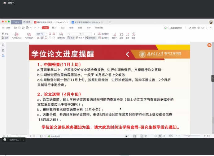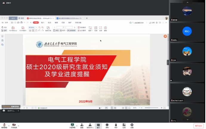 为进一步加强对硕士毕业生的就业指导工作,引导学生清晰认识就业流程,2022年9月6日晚19:00,av大平台 2020级研究生在腾讯会议线上平台召开就业须知及学业进度提醒年级会。此次年级大会由辅导员沙静馨主持,硕士2020级全体研究生线上参会。