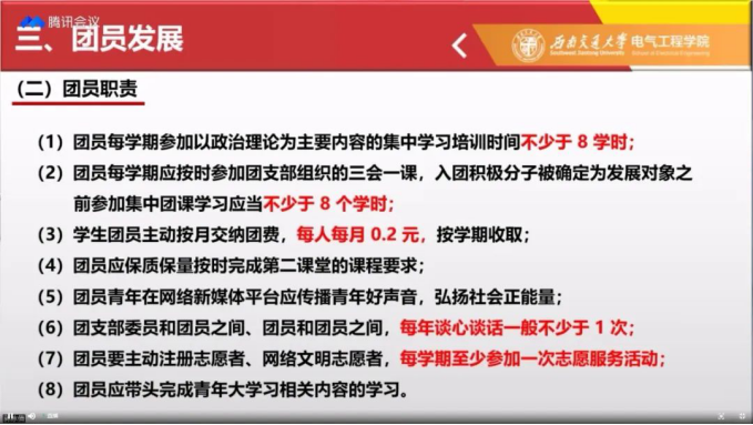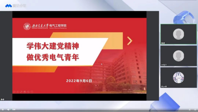 为深入学习贯彻习近平新时代中国特色社会主义思想,引导青年学生找准自身定位,厚植爱党爱国情怀,9月6日晚19:00,av大平台 本科2022级开展了新生党团教育专题讲座。本次讲座以线上会议的形式开展,主讲人为辅导员郭冰倩、詹睿,2022级辅导员及全体新生参加讲座。