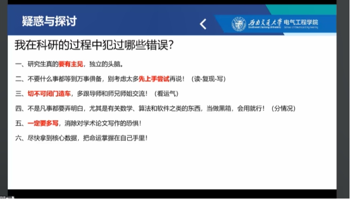 孟祥宇建议,研究生在科研生活中一定要有主见、保持独立思考,要勇于尝试,要与导师同学多交流,多读多写论文。并强调同学们要学会自主学习,对新阶段的师生关系要有正确的认识。
