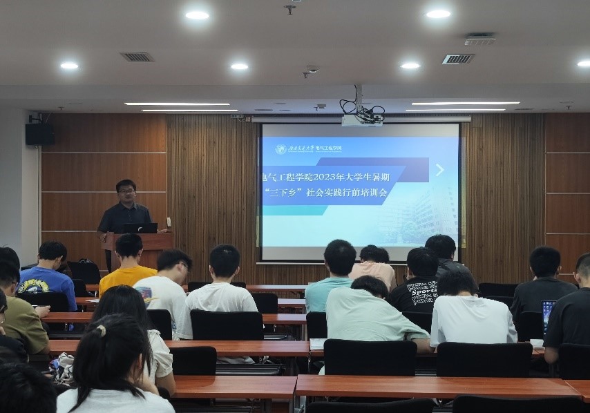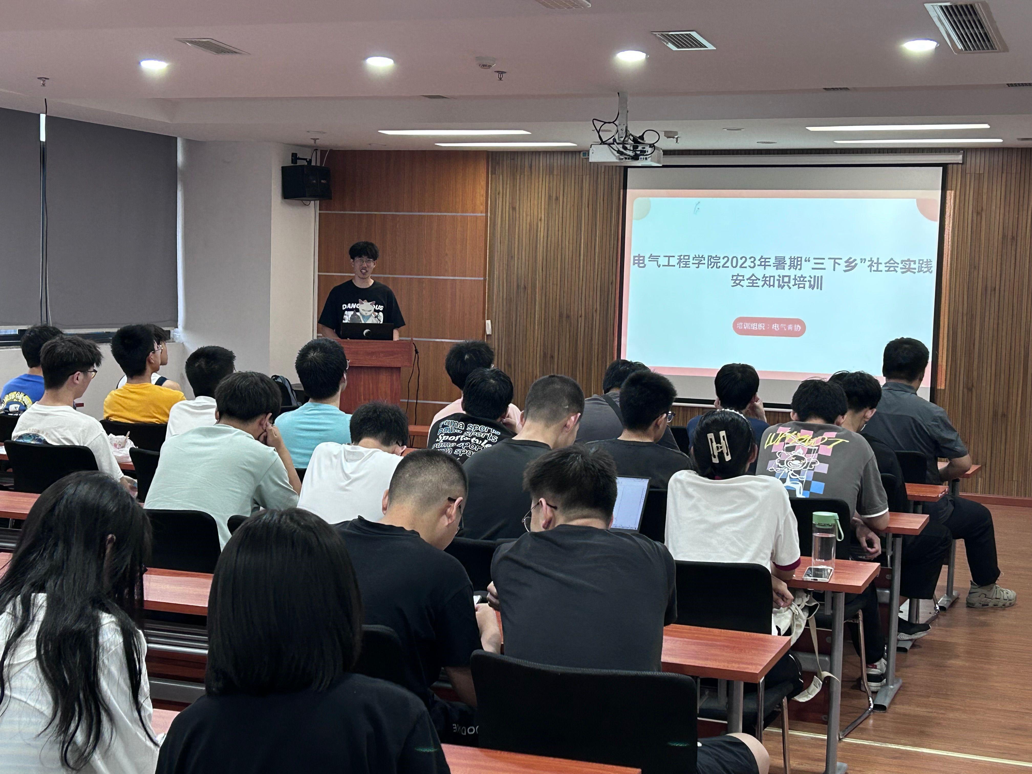 为提高大学生参与社会实践活动的安全意识、避险常识和应急救护能力,同时激发大家参与实践活动的热情,2023年7月3日晚上7点,av大平台 大学生暑期“三下乡”社会实践安全培训暨动员大会在电气馆X10832举行,学院社会实践工作负责人孙海洋老师、青年志愿者协会会长以及各实践队队长和队员一起参加本次会议。