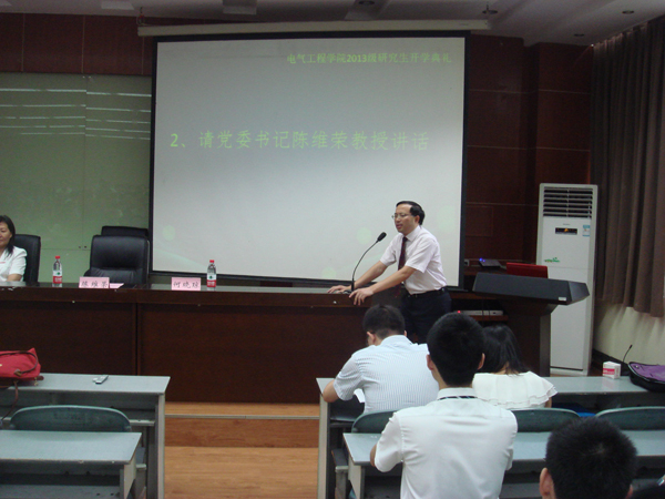 典礼的第一项议程为全体起立,奏唱国歌,嘹亮的歌声拉开的典礼的第一幕。陈维荣书记首先为大家讲话,陈书记表达了对13级研究生新生的热烈欢迎,并向各位13级新生介绍了学院的发展历史以及基本情况,陈书记着重介绍了电气学院近几年丰硕的科研成果,用事实告诉了13级新生作为“电气人”应有的自豪。在场的同学们也被陈书记感染,为电气学院的辉煌成就热烈鼓掌。