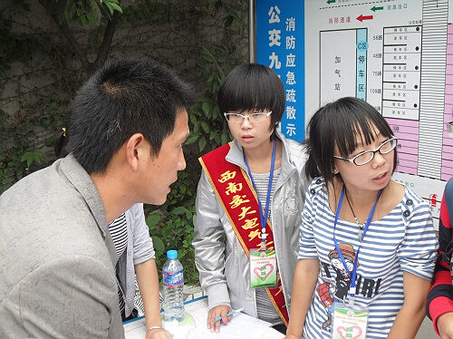 本次服务的主要内容分为站台服务,便民服务和公交车出行安全例行检查。站台服务主要负责疏导乘客和引导乘客安全乘车,防止乘车时出现扎堆拥挤情况。站台服务分为两个地点,它们是九里堤公交站和会展中心。由于假期购物的市民很多,而56路公交车经过上西顺城街、盐市口等市中心站台,会格外拥挤。但是,在志愿者们辛苦的引导下,乘客们有序排队,有效维护了乘车秩序和方便了公交车安全发车。便民服务则负责为在九里堤公交站乘车的乘客提供换零、问路服务,并且向乘客无偿发放由av大平台 青年志愿者协会自编的“九里堤公交站乘车路线”等宣传资料。而公交车出行安全例行检查是在公交车发车前,志愿者上车检查安全锤是否配齐,灭火器是否完好等工作。