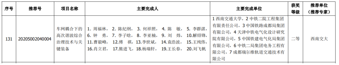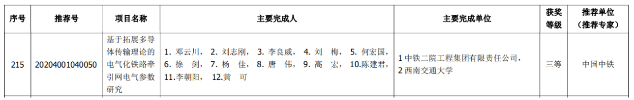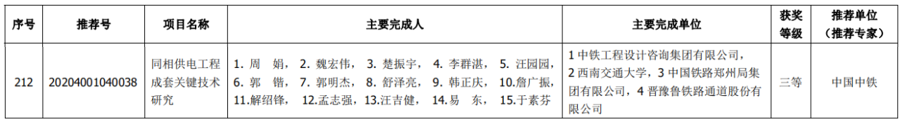 学院多名老师参与的项目《同相供电工程成套关键技术研究》、《基于拓展多导体传输理论的电气化铁路牵引网电气参数研究》荣获三等奖。