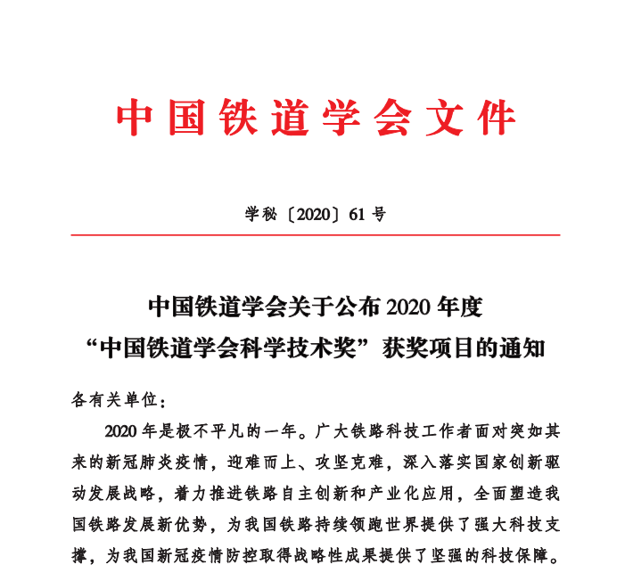 近日,中国铁道学会正式公开2020年度“中国铁道学会科学技术奖”获奖项目。根据《中国铁道学会科学技术奖奖励办法》规定,经中国铁道学会科学技术奖评审委员会审定,对2020年度为我国铁路科技创新事业做出重大贡献的科技工作者和单位给予奖励。av大平台 荣获一等奖两项,二等奖一项,三等奖两项。