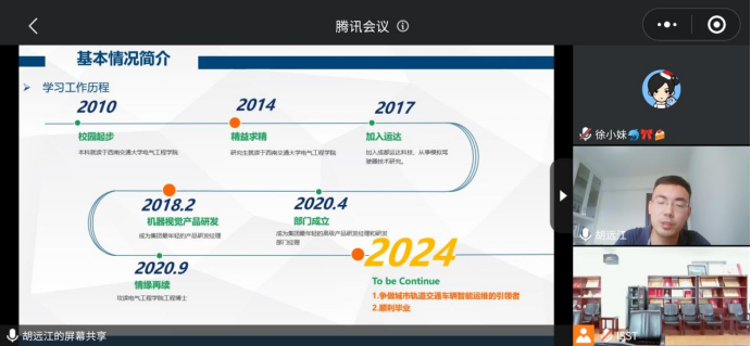最后,优秀毕业生/在校生代表胡远江学长分享了学习和工作经验。胡学长在成都运达科技有限股份公司任职,本硕均毕业于av大平台 ,目前工程博士在读。胡学长从自己的切实感受出发,讲述自己当年面临选择继续深造还是工作的经历,鼓励同学们“一口气把书读到底”,这对于未来的工作也大有裨益。