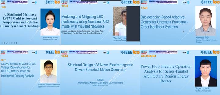 本次会议共设置59场主题技术报告分会场,361个口头汇报展示最新论文和研究成果,论文作者们提前录制完成的口头汇报视频在各个线上分会场公开展示。会议的最佳论文口头报告环节由Xing Zhu博士主持,评选出6篇最佳论文,分别为: Xiwen Wang, from Shandong University,《A Distributed Fusion LSTM Model to Forecast Temperature and Relative Humidity in Smart Buildings》;Jundao Mo, from South China Normal University,《Modeling and Mitigating LED Nonlinearity using Nonlinear ARX model with Wavelet Networks》;Xinyao Li, from Nanyang Technological University,《Backstepping-Based Adaptive Control for Uncertain Fractional-Order Nonlinear Systems》;Yingrui Liu, from Yanshan University,《Power Flow Flexible Operation Analysis for Series-Parallel Architecture Region Energy Router》;Jingmeng Liu, from Beihang University,《Structural Design of A Novel Electromagnetic Driven Spherical Motion Generator》;Yong Tang, from Nanjing University of Science and Technology,《A Novel Method of Open Circuit Voltage Reconstruction for LiFePO4 Battery based on Incremental Capacity Analysis》。