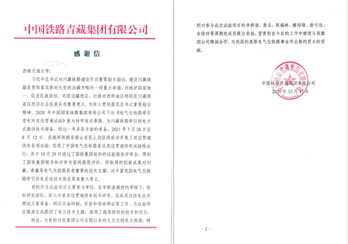 2021年12月17日,av大平台 收到中国铁路青藏集团有限公司发来的感谢信。信中表示,av大平台 协同中国铁路青藏集团有限公司参与攻关国铁集团立项的《电气化铁路牵引变电所双边贯通试验》重大科学课题,在av大平台 李群湛教授科研团队的全力参与和积极配合下,圆满完成试验任务,特此表示感谢,并对参与此次试验项目的李群湛、易东、周福林、解绍锋、徐可佳、余俊祥等课题组成员提出表扬。