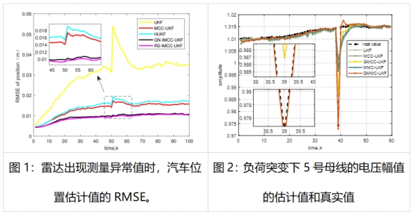 无迹卡尔曼滤波器(UKF)是进行目标跟踪的经典非线性算法,尽管已经广泛应用于自动驾驶、准制导、虚拟现实、医学诊断、电力系统状态估计等领域,仍然存在非高斯噪声干扰、测量方程模型不够精确和数值稳定性差等问题。赵海全教授课题组系统地研究了基于信息论学习准则的鲁棒、稳定与迭代UKF跟踪算法,有效解决了测量方程的模型不够精确和数值稳定性差的问题,实现了快速精确、稳定的汽车目标跟踪;消除了电力系统中出现的脉冲噪声、普拉斯噪声、不良测量数据和负荷突变等带来的危害,并通过IEEE 14、30和57节点测试系统验证了异常情况下跟踪算法执行电力系统预测辅助状态估计的有效性。上述成果是在赵海全教授指导下,由硕士生田博宇、汪艮同学完成。