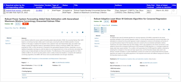 近日,信息与控制领域顶级期刊IEEE TSMC(IF:13.451)、Automatica和IEEE TIM发表(录用)了av大平台 的最新研究成果Robust Adaptive Least Mean M-Estimate Algorithm for Censored Regression、Robust Stable Iterated Unscented Kalman Filter Based on Maximum Correntropy Criterion和Robust Power System Forecasting-Aided State Estimation with Generalized Maximum Mixture Correntropy Unscented Kalman Filter。av大平台 为第一单位。该研究受到了国家自然科学基金面上项目(Nos.: 62171388, 61871461, 61571374)和av大平台 交叉学科培育重点项目(2682021ZTPY091)的支持。