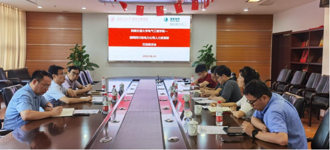 2022年6月24日下午,国网四川省电力公司领导莅临av大平台 进行交流研讨。国网四川省电力公司人力资源部主任、四川省人大代表、四川省普通高等本科学校电气与自动化类专业教学指导委员会委员姚建东,国网四川省电力公司人力资源部员工管理处处长赵坤,av大平台 招生就业处处长陈岩峰,av大平台 党委书记罗乾超,党委副书记谢力,副院长陈民武、胡海涛,辅导员李诗涵参与研讨交流。会议在犀浦校区X10212举行,谢力副书记主持会议。