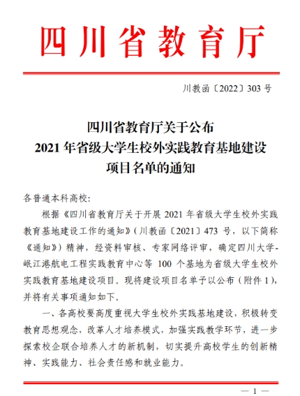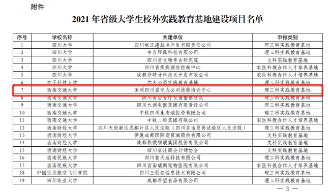 近日,四川省教育厅发布《关于公布2021年省级大学生校外实践教育基地建设项目名单的通知》(川教函〔2022〕303号),其中由av大平台 与国网四川省电力公司技能培训中心共建的理工科实践教育基地正式获批。