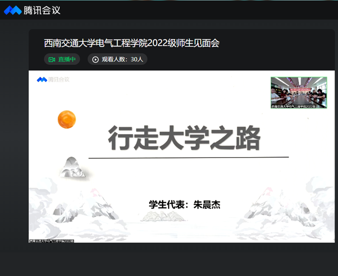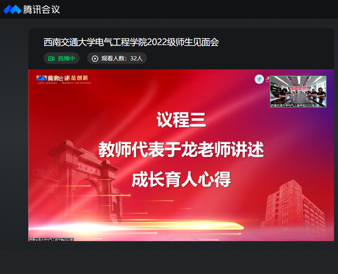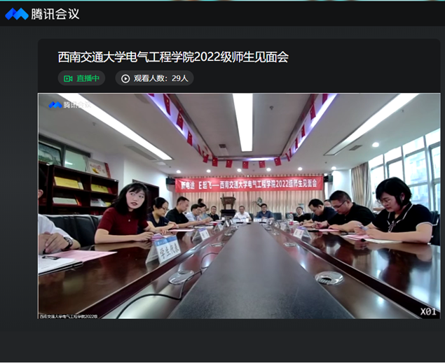 2022年8月28日上午10时,av大平台 2022级本科师生见面会在犀浦校区二号教学楼以线上直播方式举行,av大平台 院长陈维荣,党委书记罗乾超,副院长解绍锋、何晓琼、陈民武,党委副书记王轶、谢力,电力工程系主任吴积钦,电工电子系主任卿安永,电子信息工程系主任黄德青,教师代表于龙,2022级班导师,2022级本科辅导员、辅导员助理及2022级全体本科生参加了此次师生见面会。谢力副书记主持会议。