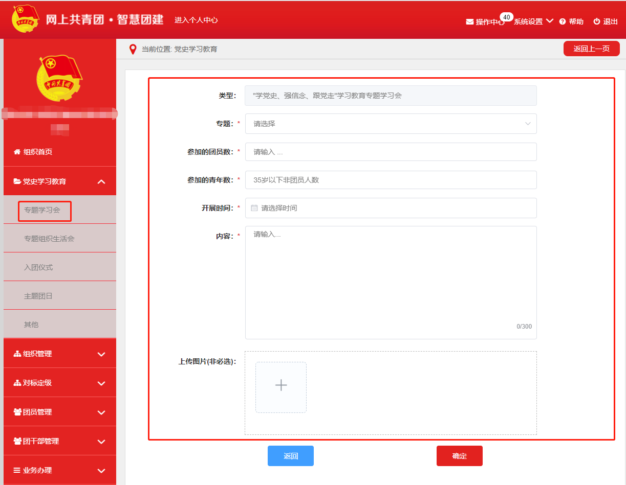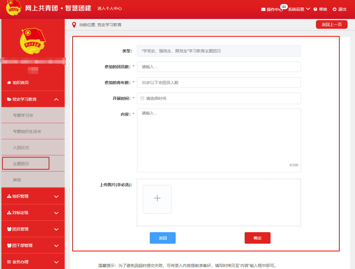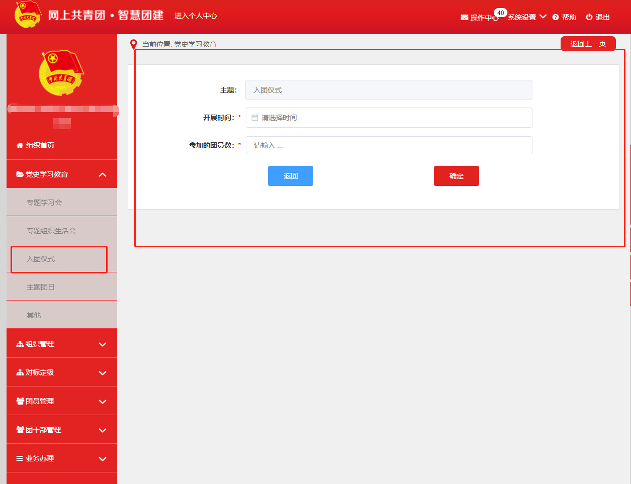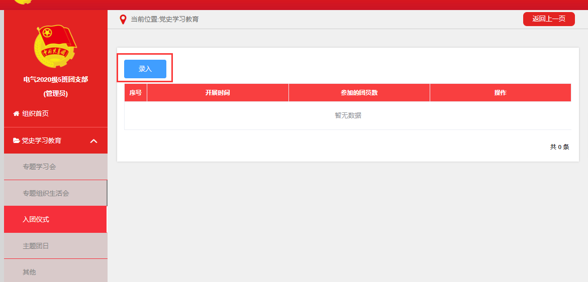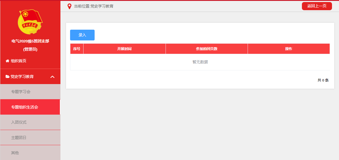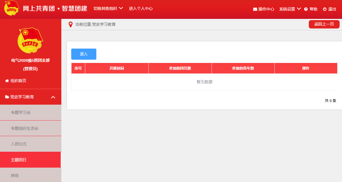 根据校团委及学院团委《2021年“学党史、强信念、跟党走”团员主题学习教育实践活动的实施方案》,各团支部需在“智慧团建”系统中“党史学习教育”模块记载学习教育情况,主要包括专题学习会、专题组织生活会、主题团日、入团仪式和其他实践教育活动开展情况及团干部开展专题宣讲等。“智慧团建”系统中“党史学习教育”模块具体录入要求如下。