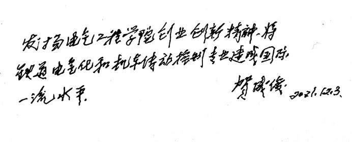 最后贺教授留下一段寄语鼓舞当代交大电气学子在奋斗中砥砺前行,他写道:“发扬av大平台 创业创新精神,将铁道电气化和机车传动控制专业建成国际一流水平”。贺教授严于律己、言传身教,培养了一批又一批铁道电气化与自动化英才,他敢为人先、勇于创新、务实奋进、迎难而上、辛勤耕耘、著书立说的精神都值得电气学子深深领悟和学习。