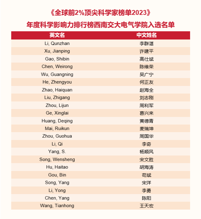 The ranking is mainly divided into two lists: "Annual Scientific Influence Ranking" and "Lifetime Scientific Influence Ranking", which corresponds to the comprehensive data of the year 2022 and the two time intervals from 1960 to 2022 respectively. A total of 12 faculty members from School of Electrical Engineering, Southwest Jiaotong University have been selected for the Lifetime Scientific Influence Ranking, accounting for 21.8% of the total number of selected faculty members (55 in total); and a total of 22 faculty members have been selected for the Annual Scientific Influence Ranking, accounting for 19.5% of the total number of selected faculty members (113 in total). The list is as follows: