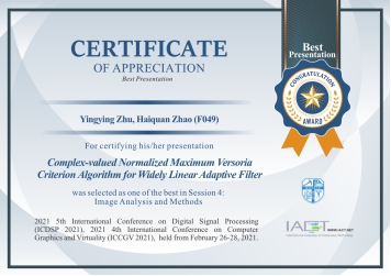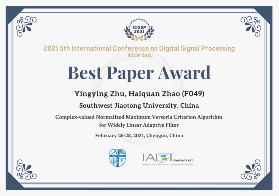 On February 26-28, 2021, the 5th International Conference on Digital Signal Processing (ICDSP2021) was successfully held online. The ICDSP2021 conference was co-sponsored by Southwest Jiaotong University and Association for Computing Machinery (ACM), and technically supported by many universities and institutions. Professor Xiaodong Wang (IEEE Fellow) from Columbia University, Professor Erchin Serpedin from Texas A&M University (IEEE Fellow), Professor Graziano Chesi (IEEE Fellow) from the University of Hong Kong, China, and Professor Gu Yuantao from Tsinghua University around the conference research field Carried out the theme report. Experts and scholars from the United States, Germany, China, Japan, Hong Kong and other countries and regions participated in the conference through online conferences. This conference selected total of 6 "Best Presentation" and 1 "Best Paper Award". PhD student Yingying Zhu, a member of Prof. Haiquan Zhao's team, was awarded the Best Paper Award, while both she and PhD Gebeyehu were awarded the Best Presentation Award.