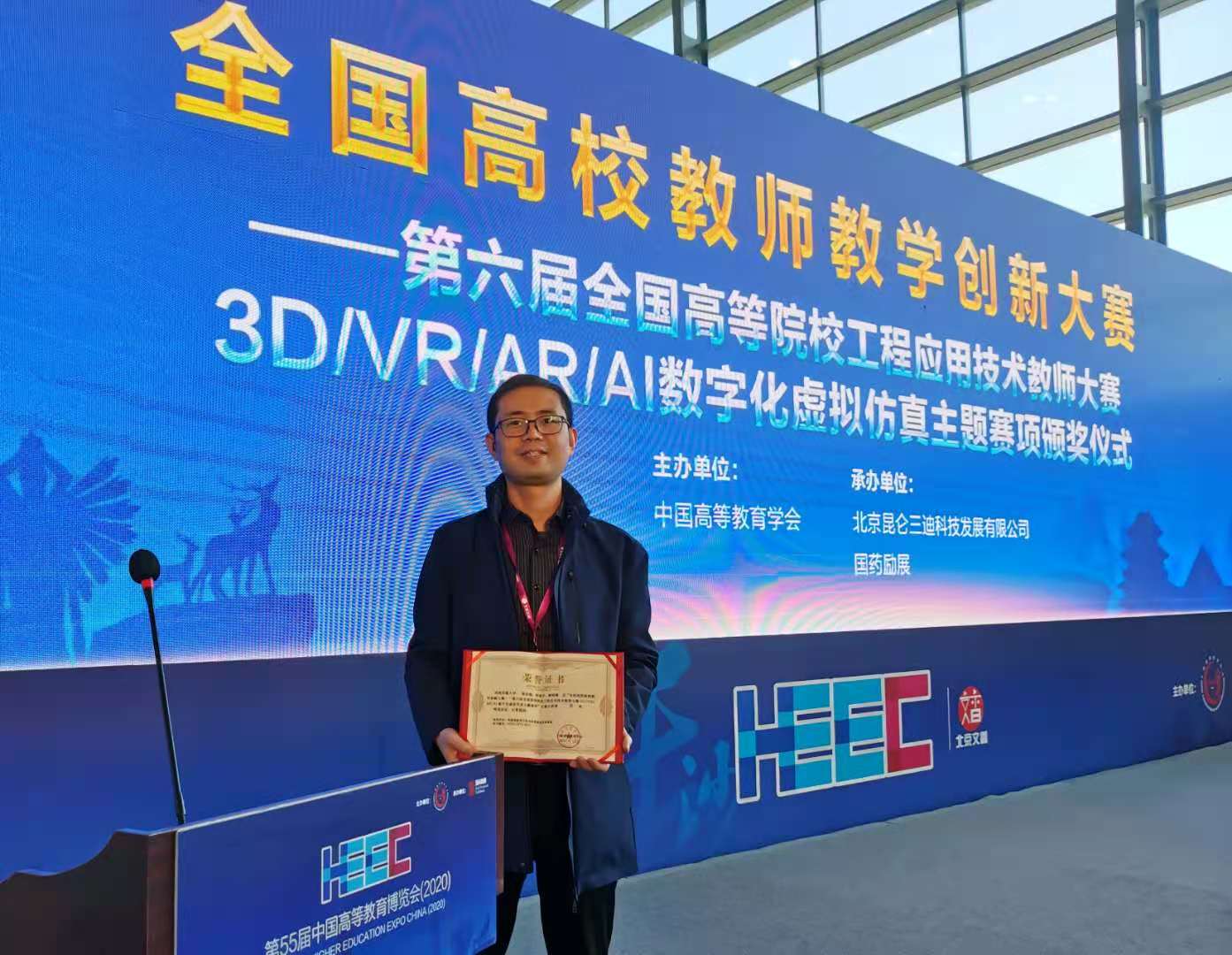 On Nov. 10, the awarding ceremony of 3D/VR/AR Digital Virtual Simulation Competition of National College Teachers' Teaching Innovation Competition was held in Changsha, Hunan Province. Our team, Chen Jin-qiang, Zhao Li-ping and Xie Shao-feng, won the second prize in the national finals.