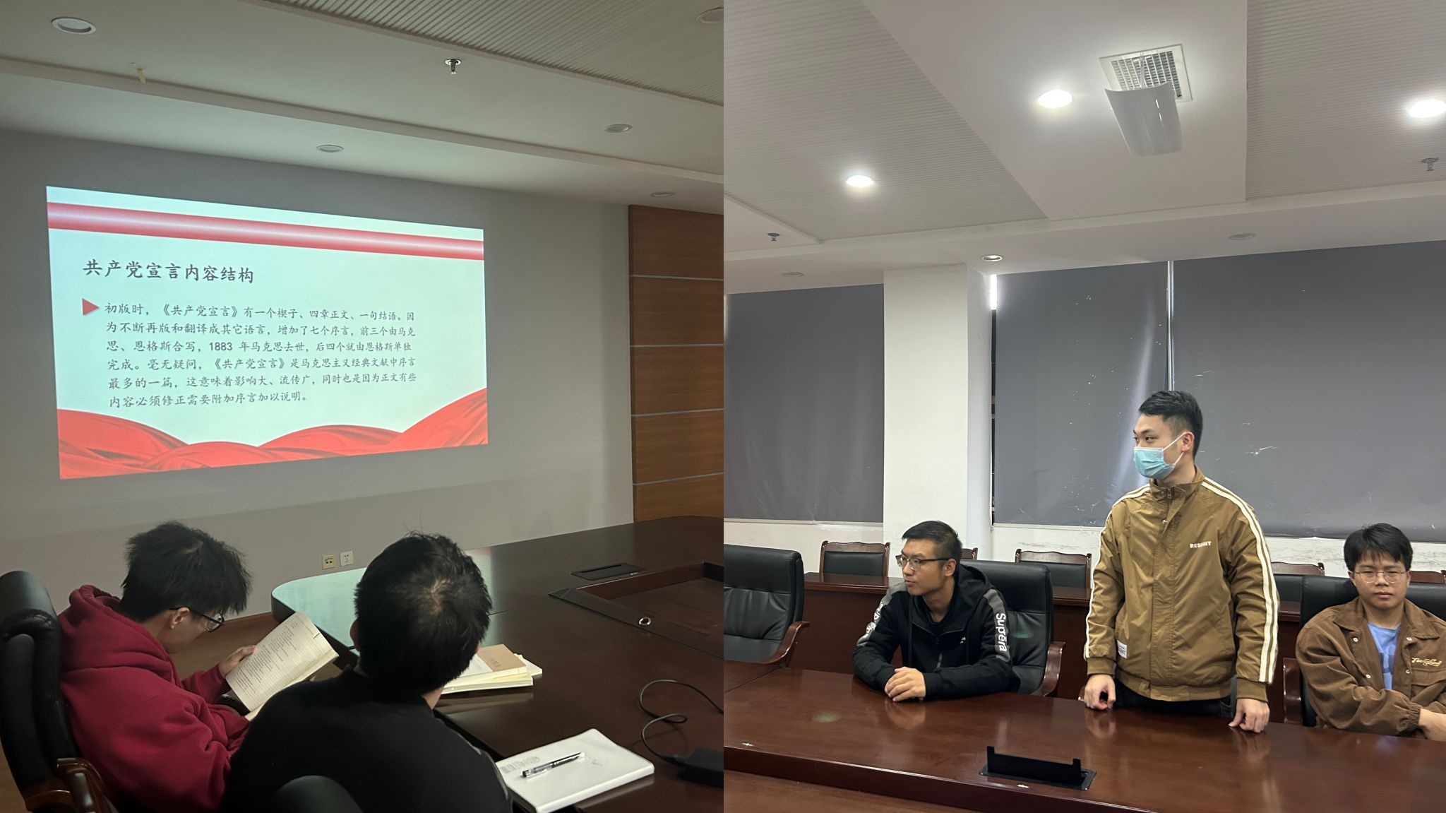 其次支部成员侯杰夫与刘一同志分享了自己学习《共产党宣言》的心得体会。指出马克思主义思想理论博大精深,《共产党宣言》等马克思主义经典著作包含着人类探索真理的丰富思想成果,体现着经典作家攀登科学理论高峰的不懈追求和艰辛历程。