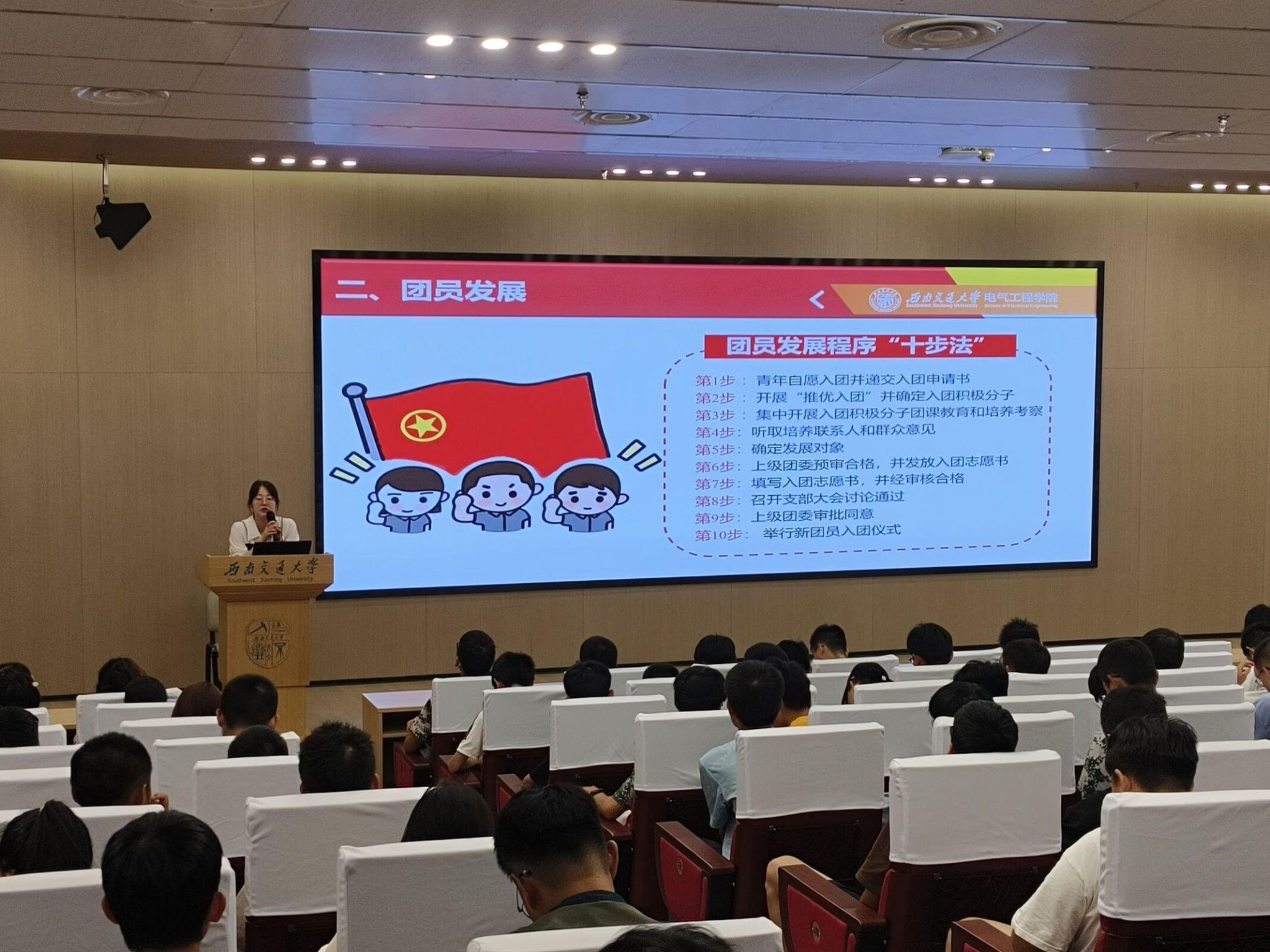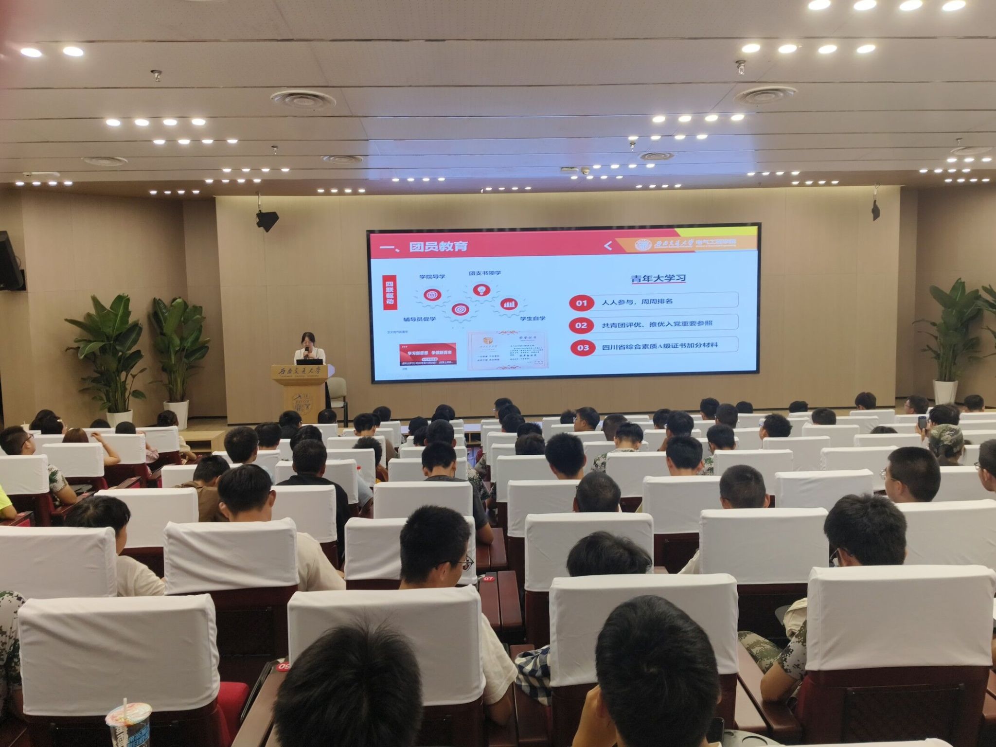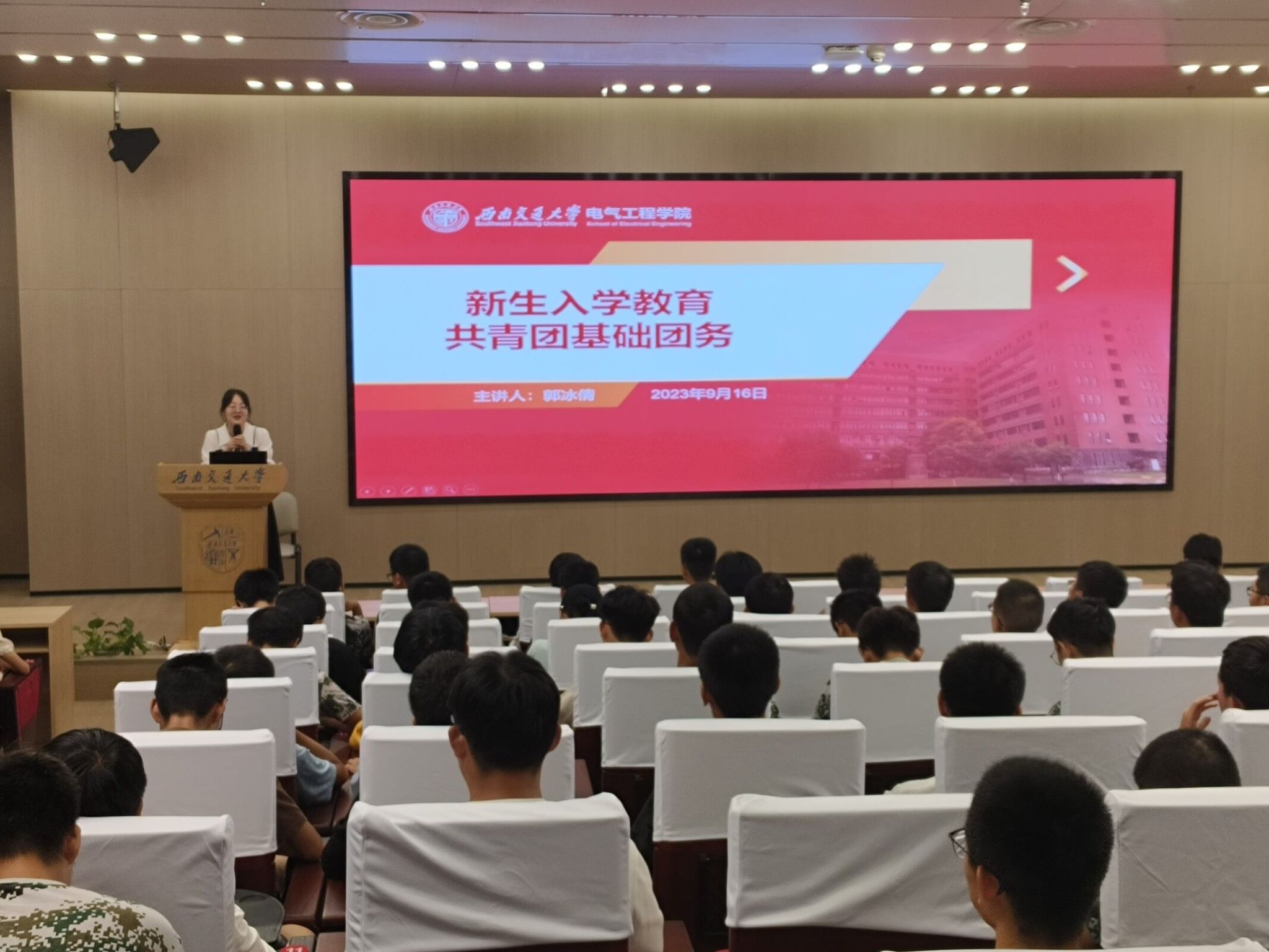 2023年9月16日晚上19:00,av大平台 本科2023级在av大平台 犀浦校区一号报告厅开展共青团基础团务专题讲座。此次讲座由辅导员郭冰倩老师主讲,电气学院本科2023级辅导员詹睿、罗霁轩和全体新生参与。