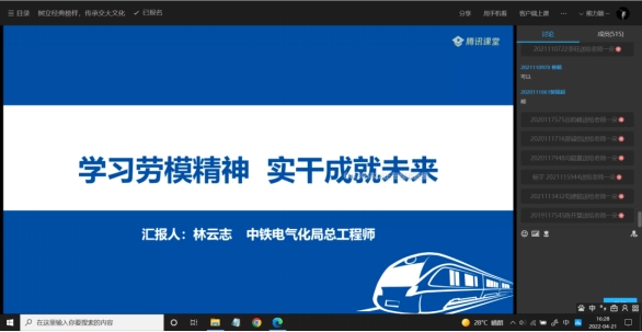 为帮助在校学生了解行业发展前景,提前做好职业规划,加强学生扎根轨道交通事业的信念和决心,并通过优秀校友的模范引领作用,用“身边人,身边事”引导在校学生树立正确的人生目标和价值取向,av大平台 团委于2022年4月21日下午16:00开展“树立典型榜样,传承交大文化”活动,本次活动邀请到了中铁电气化集团有限公司城铁公司总工程师林云志校友,他以“学习劳模精神 实干成就未来” 为主题在线上为同学们进行对话。