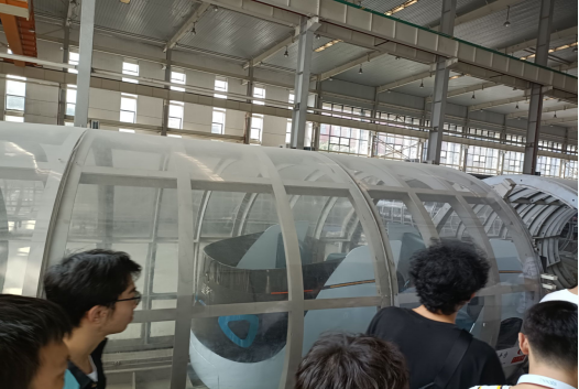 最后同学们来到了真空管道高温超导磁浮车高速实验台,令同学们赞叹的是超导磁浮在100m的管道中能够加速到400km/h,目前实验速度已经能够达到350km/h。提到目前面临的杜瓦持续保温能力弱的问题,王博士鼓励同学们努力学习,未来加入科研团队,为母校和祖国献出一份自己的力量。