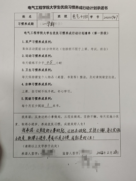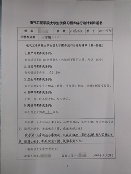 2022年2月,全体本科21级同学按照自己实际情况,填写《av大平台 大学生优良习惯养成行动计划承诺书》,并贴在自己宿舍位子上(墙、桌子、柜子门等显眼位置均可),将填写好的承诺书拍照上传班群及朋友圈。各位同学结合自己实际情况,自行设立承诺书上的双严习惯、运动习惯、卫生习惯、自律习惯和阅读习惯养成计划,并规定习惯养成期,自我监督或请他人监督。