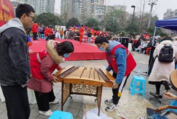 为保证表演活动准备工作的顺利进行,我志愿服务团队早早来到广福桥社区活动现场,与其他志愿者一起听从调配。在接到任务之后,所有志愿者分头行动,开始了忙碌的准备。我们志愿小组不甘落后,更加积极地投身于服务工作中。据场地安排,活动现场用地分为表演台,观众席,猜灯谜场地,和几家医院的公益义诊场地摊位。而我们志愿小组负责组织猜灯谜,协助演员,观众调查和罗浮广场参观等。随着活动的开始,约有一百二十名观众陆续进场坐下,志愿者们也各就各位,投入紧张的工作当中。表演开始了,台上精彩纷呈,川剧、舞蹈、乐器、歌唱、魔术节目兼而有之,赢得台下观众掌声连连。在不忘工作的同时,我们志愿小组也加入观众的行列,与大家一起欣赏缤纷的节目。