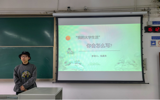 朱晨杰开篇便向同学们提出一个问题,“如果以‘我的大学生活’为题,写一篇作文,你会怎么写?”围绕着这个问题,他以自我介绍,学习之旅,干部经历,生活爱好,感悟总结五个模块来讲述自己会怎么写“我的大学生活”。在课程学习上,他主要强调了笔记、及时总结反思和自主学习的必要性,鼓励同学不要懈怠,抓紧时间提升自我。此外,他在课外竞赛和科研训练方面也结合自身经历给出了独到意见。丰富的干部经历不仅增强了他的责任心,也提高他的沟通交流能力和组织协调能力。他还鼓励同学们去培养更多元、更开放、更有益身心的兴趣,不要沉迷于游戏和追剧。最后,他总结到,有自己的定位,有时间的管理,有自学的能力才是当代青年人迈向成功的必由之路。