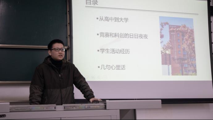 叶雨润首先讲述了自己从高中到大学的转变。他认为,同学们应该先适应角色转换,有的人可能会陷入迷茫,但在迷茫中要有取舍,并且还要用书籍和学生活动来建设自己的精神世界。然后,他又在科创和竞赛方面给同学们建议,同学们应该专攻一个方面,抓住机会,用比赛驱动学习,还要将课程学习与竞赛结合起来。最后,他以自己的学生活动经历来告诫大家珍惜时间,提高效率,避免“完美主义”。