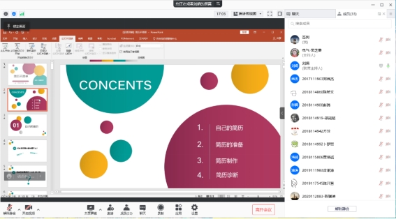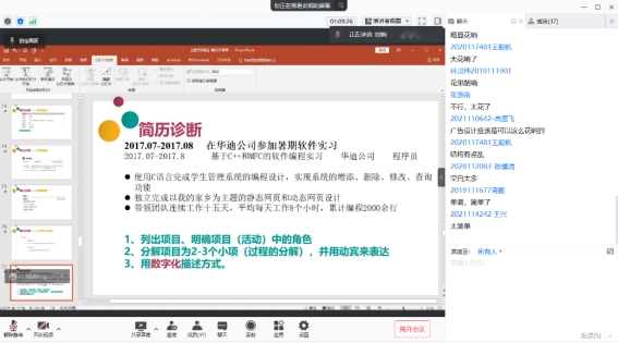 2021年11月17日,av大平台 “职得”成长训练营第一期:简历不简单顺利举行。受疫情影响,本次活动采取线上的方式进行,主讲人为av大平台 计算机与人工智能学院刘娟老师,训练营全体同学参加,会议由辅导员樊芝菱主持。