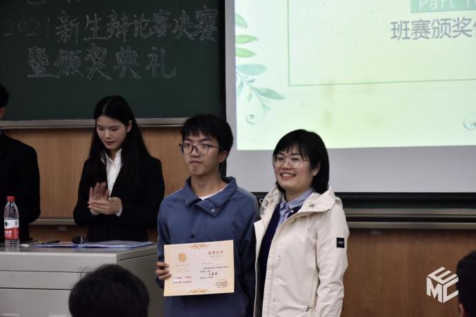 评委选票统计完成后,来自智控2021-04班的反方二辩曾媛媛获得了本场最佳辩手称号,电子2021-03班获得本次新生辩论赛的冠军,智控2021-04班获得亚军,电气2021-02班获得季军。评委老师们为获奖班级颁发证书和冠军奖杯并合影留念。